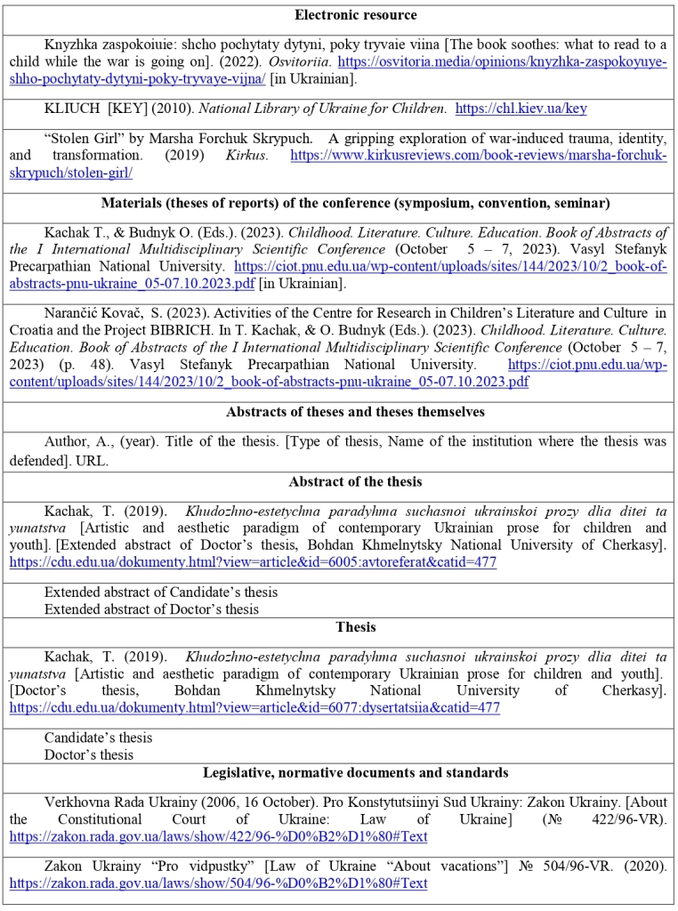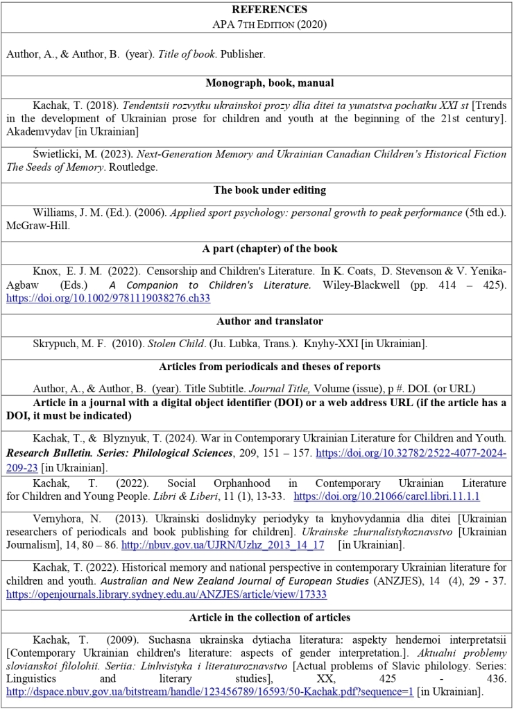 5. Оформлені відповідно до вимог статті слід завантажувати на сайт журналу та надсилати на електронну адресу tetiana.kachak@сnu.edu.ua з темою листа: “Children's literature:  interdisciplinary discourse”, прізвище та ім’я автора.